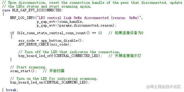 BLE_GAP_EVT_DISCONNECTED 断开状态,先判断了是否有设备连接,并且在最后重新开启扫描。
