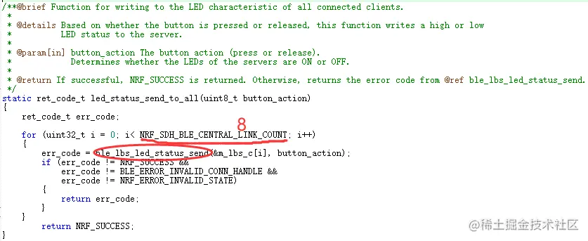 一旦触发了蓝牙事件 BLE_LBS_C_EVT_BUTTON_NOTIFICATION,在蓝牙事件回调函数 lbs_c_evt_handler 中,根据不同的 p_lbs_c_evt->conn_handle 决定不同的从机链路,来点亮哪个LED灯。