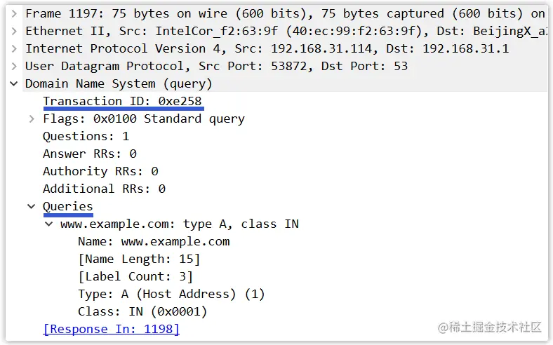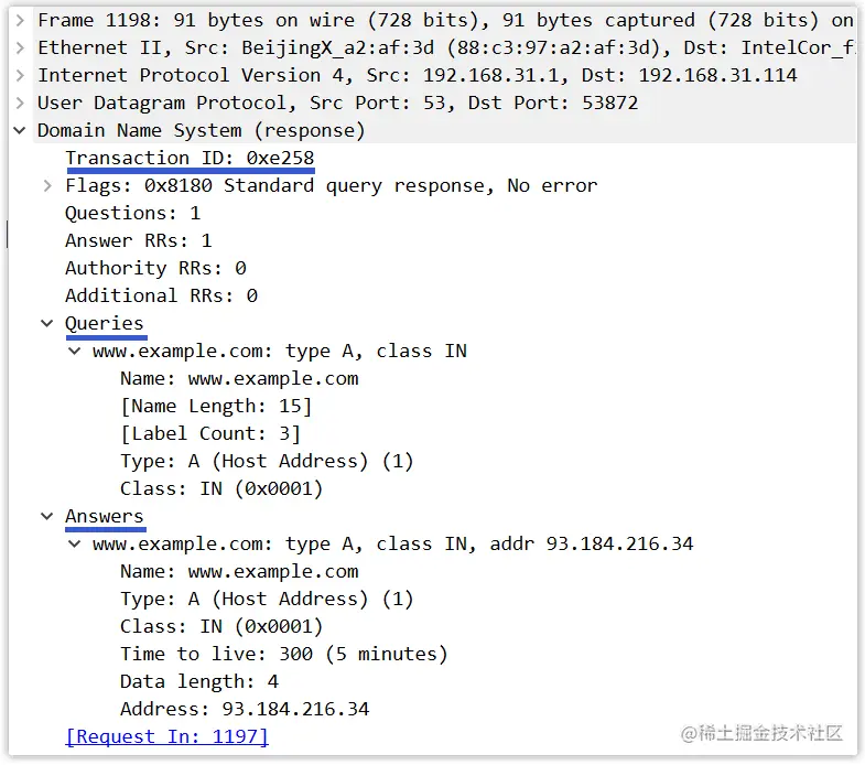 事务 ID:用于标识 DNS 查询的标识符。查询报文和其对应的回答报文有着相同的事务 ID,因此通过它可以区分 DNS 回答报文是对哪个请求进行响应的。标志:此字段中含有若干标志,比如有一个『QR』标志位用于指出此报文是查询报文(0)还是回答报文(1),再比如有一个『TC』标志位用于指出此报文长度是否大于 512 字节。问题数:对应于下面查询问题的数量(支持同时查询多个域名,通常为一个)。回答资源记录数:对应于下面回答问题相关资源记录的数量(一个域名可能有多个 IP 对应,那么将会有多个回答记录)。权威资源记录数:对应于下面权威域名服务器相关资源记录的数量。附加资源记录数:对应于下面附加信息相关资源记录的数量。查询问题:此区域为查询内容,包含查询域名和查询类型(如 *www.example.com,A*)。回答问题:此区域为查询结果,包含一到多条资源记录(如 www.example.com,93.184.216.34, A,300)。权威域名服务器:此区域为其他权威域名服务器的记录,即含有指向权威域名服务器的资源记录,用以继续解析过程。(如 baidu.com,ns1.baidu.com,NS,172800)。附加信息:此区域为其他有帮助的信息,比如提供权威域名服务器所对应的 IP 地址。