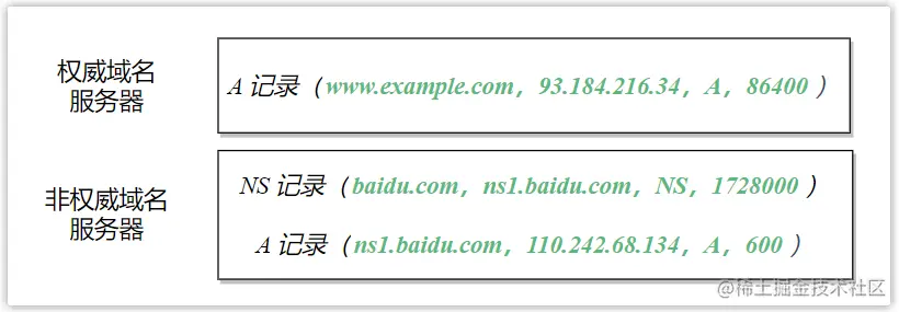 如果一台域名服务器不是用于某特定域名的权威域名服务器,那么其将包含一条 NS 记录,该记录用来指定该域名由哪个域名服务器来进行解析;除此之外,它还将包含一条 A 记录,该记录提供了在 NS 记录中 Value 字段中的域名服务器的 IP 地址。
