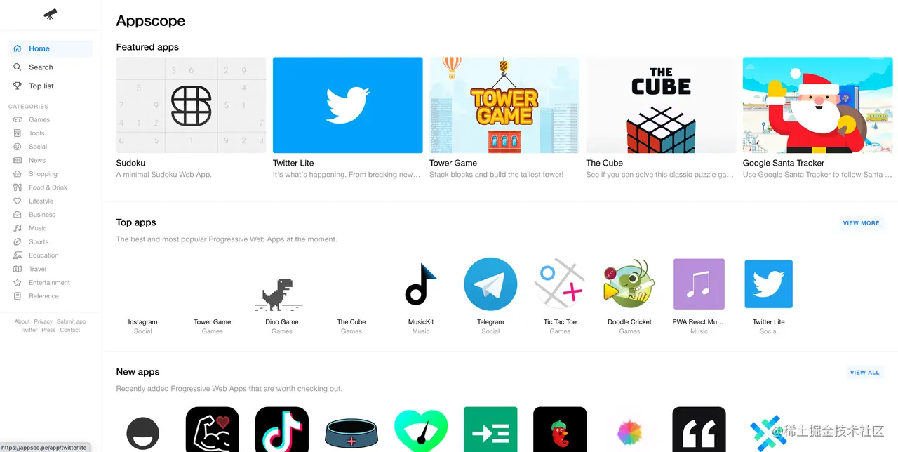 AppScope 就是近年来出现的 PWA 应用商店中最值得介绍的那一个:因为它无论是从 UI 界面设计、应用详情页、以及应用推荐机制(热门应用/新应用),以及应用详情页来看,都无愧于「应用商店」这一称号,甚至已经可以与 Play Store 或 App Store 相提并论。