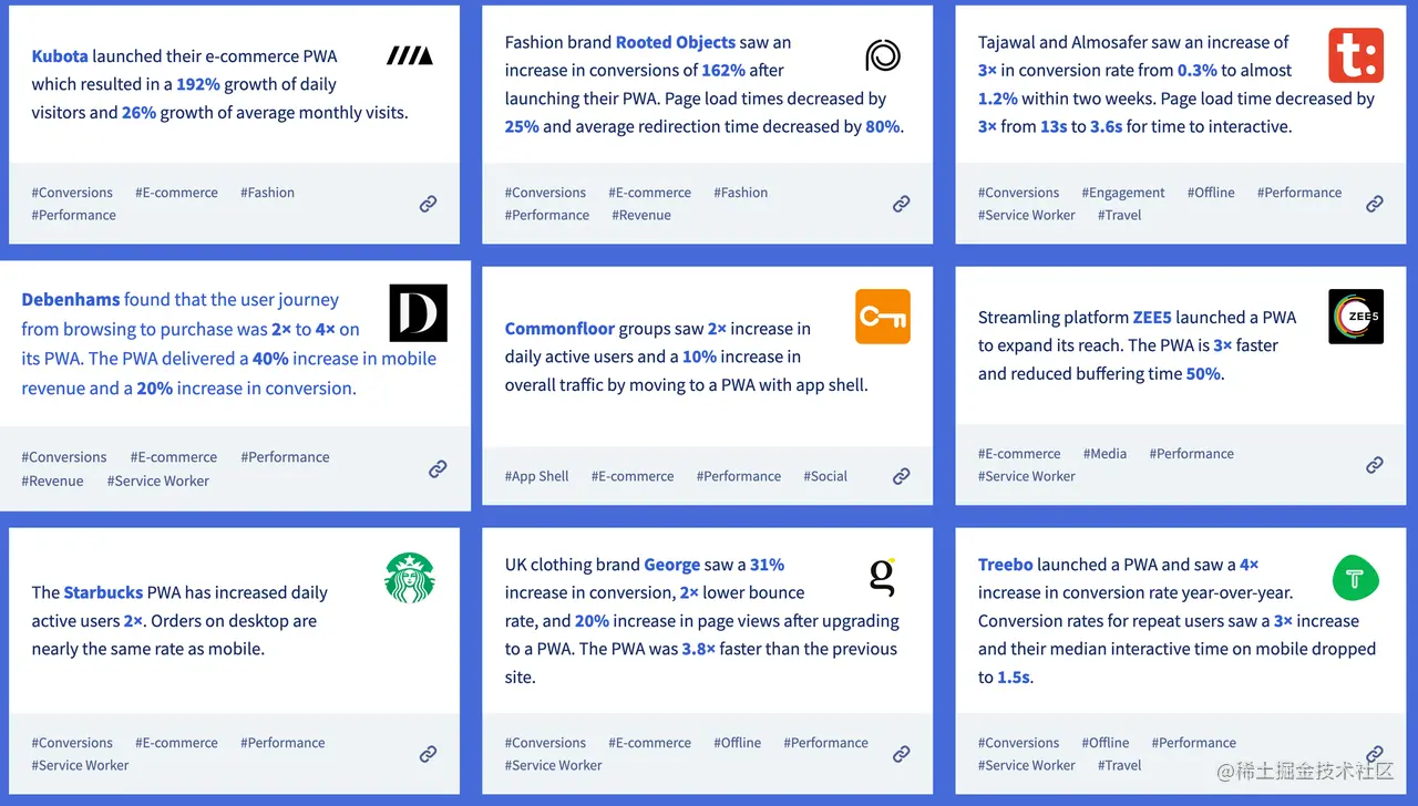 除此之外,你还可以前往 PWA Stats 找到更多 PWA 应用;这个网站主要收录 PWA 应用的开发动态与实例,你还能从这里找到 Google 与 饿了么 合作开发 PWA 的相关细节以及「为什么应用开发商仍然想让你安装原生应用」的文章,是一个偏开发者向的 PWA 资源站。