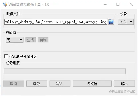 下载系统镜像到本地电脑并安装好Win32DiskImager之后,然后将TF链接到电脑,就可以开始烧写系统了,打开烧写工具,选择镜像文件,选择TF卡对应的设备,然后点击“写入”按钮,即可开始烧写。