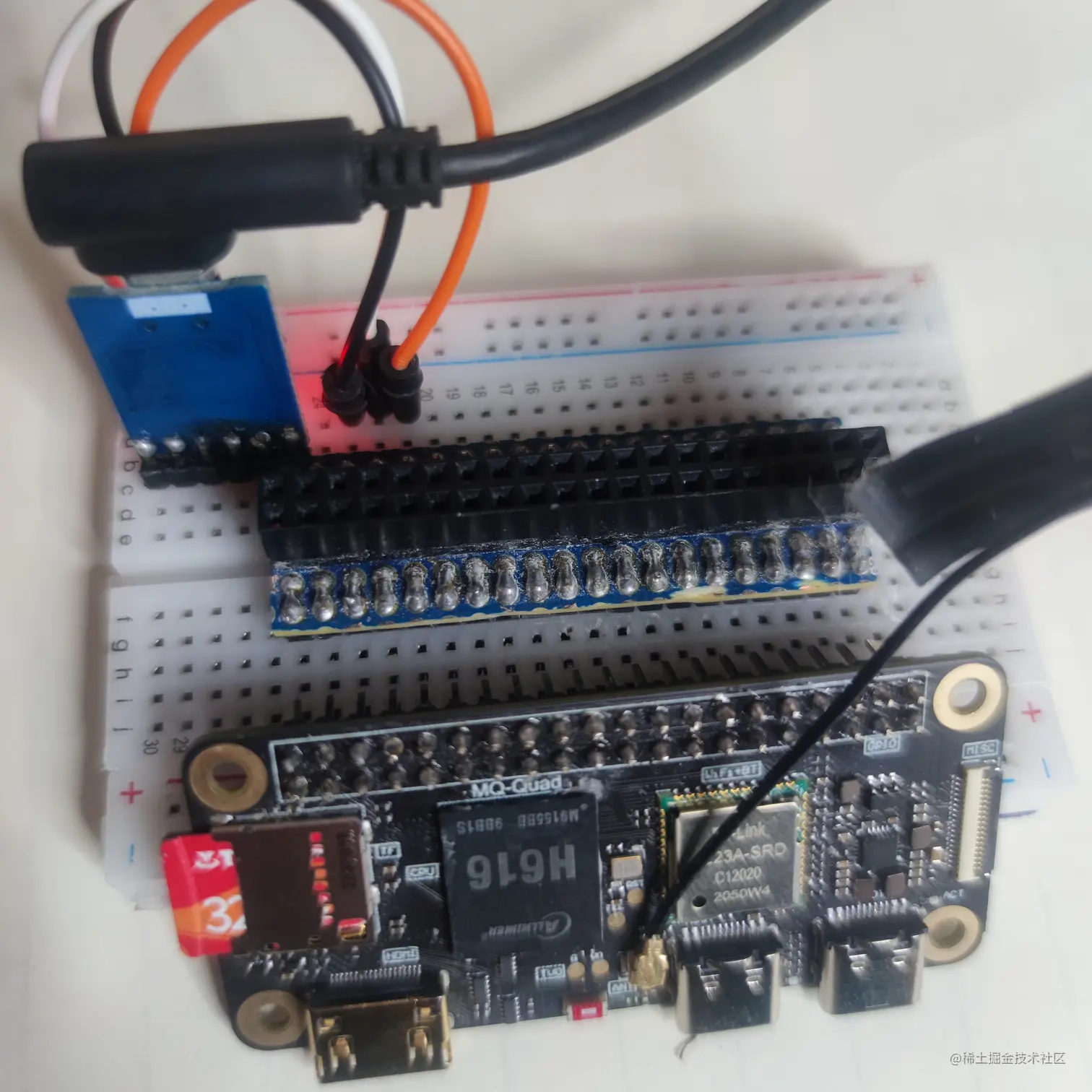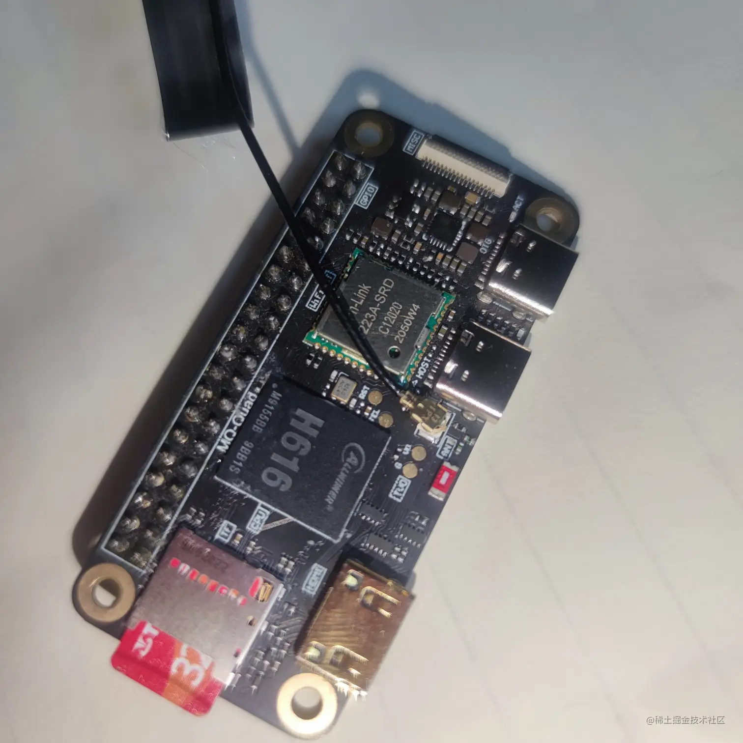 由于这篇文章写得比较晚,所以没有开箱的图片,我就简单拍了一张我这边已经使用了一段时间之后的照片,从图中可以看到,我自己加了一个金黄色的散热片(为了省钱,没有买原配的散热片), 然后自己把排针焊接上。