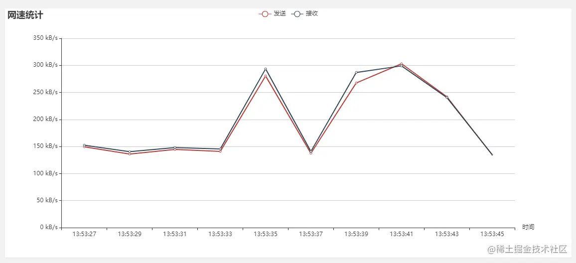 通过时刻图展示每一秒发送网速和接收网速,可以通过当前的网络情况对程序的运行状态进行一定的判断。