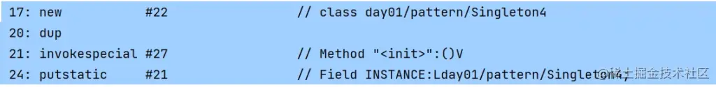 我们通过反编译class文件,可以看到在**instance = new LazySingleton()**这一行代码所对应的指令是什么。