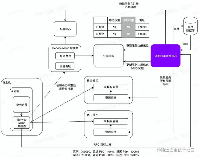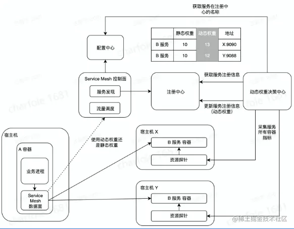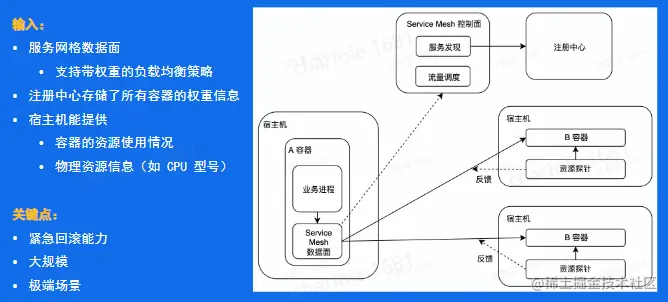 输入:控制面存储容器的权重信息,数据面支持带权重的负载均衡策略,宿主机提供当前机器的资源信息。