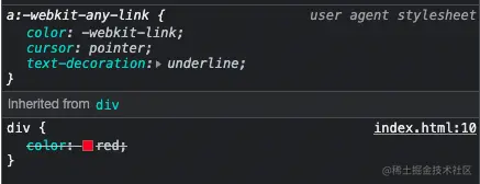 通过浏览器调试工具我们可以看到,a标签在浏览器的默认样式表(用户代理样式表)表中存在color属性,所以计算的过程中,第一步就已经确定了a标签的color属性值了