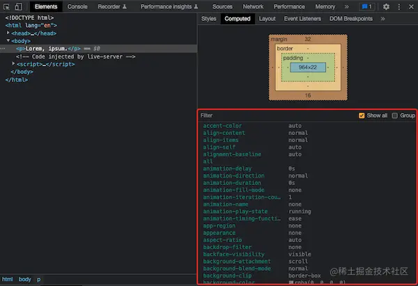 由图中我们可以看到,一个自定义不书写任何样式的p元素在样式计算过后都会产生很多的样式值,这是因为浏览器渲染每个元素的前提条件是,该元素的所有CSS属性必须有值