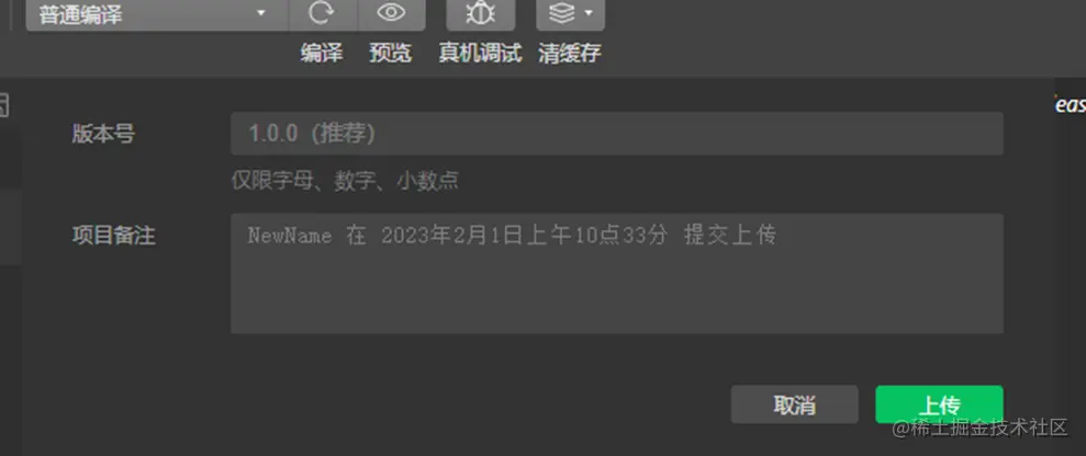 笔者在开发小程序时发现:上传代码到小程序后台时,需要手动填写版本号和备注信息,如下图所示: