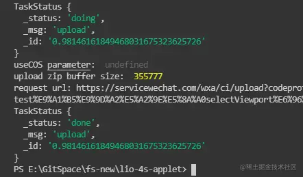 这样在运行npm run upload 命令之前先运行npm run commit 和 npm run release 命令即可。这样就做到了自动上传小程序代码到小程序后台了。如下图所示: