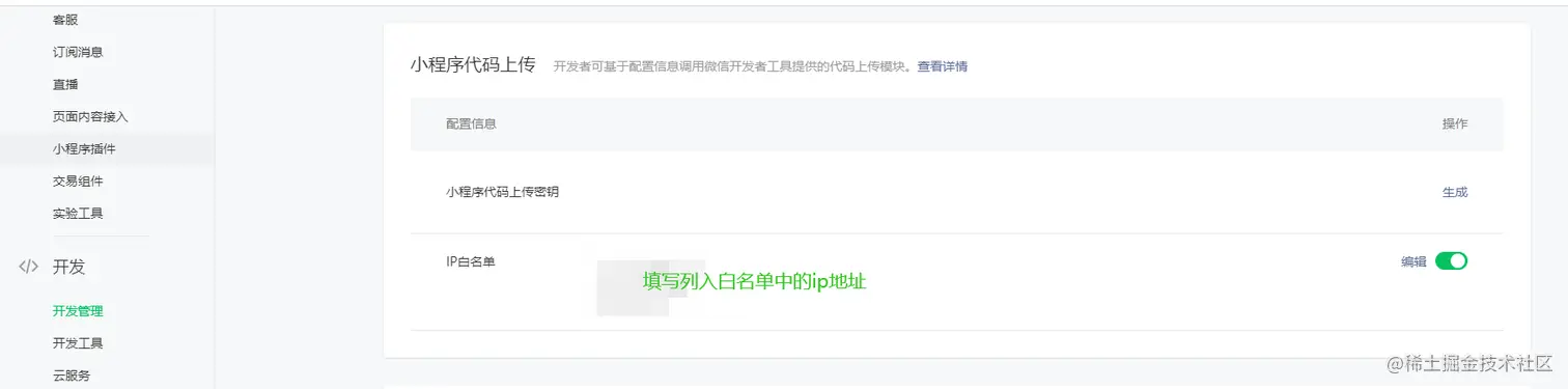 2.配置 IP 白名单。访问"微信公众平台-开发 -开发管理- 开发设置-小程序代码上传" ,开发者可选择打开 IP 白名单,打开后只有白名单中的 IP 才能调用相关接口。这里笔者提醒大家注意:编辑IP白名单时需要小程序的管理员扫描二维码。
