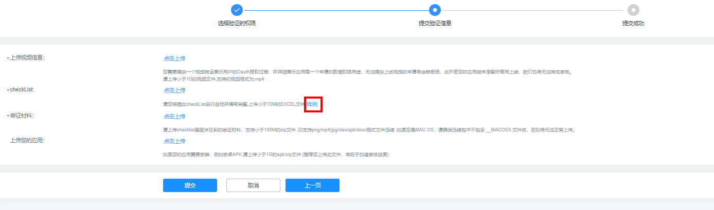 答:开发者提交申请验证时,必须提交自检结果填写完整的《应用上线Checklist》,并确认提交的举证材料符合Checklist中要求的验收标准。