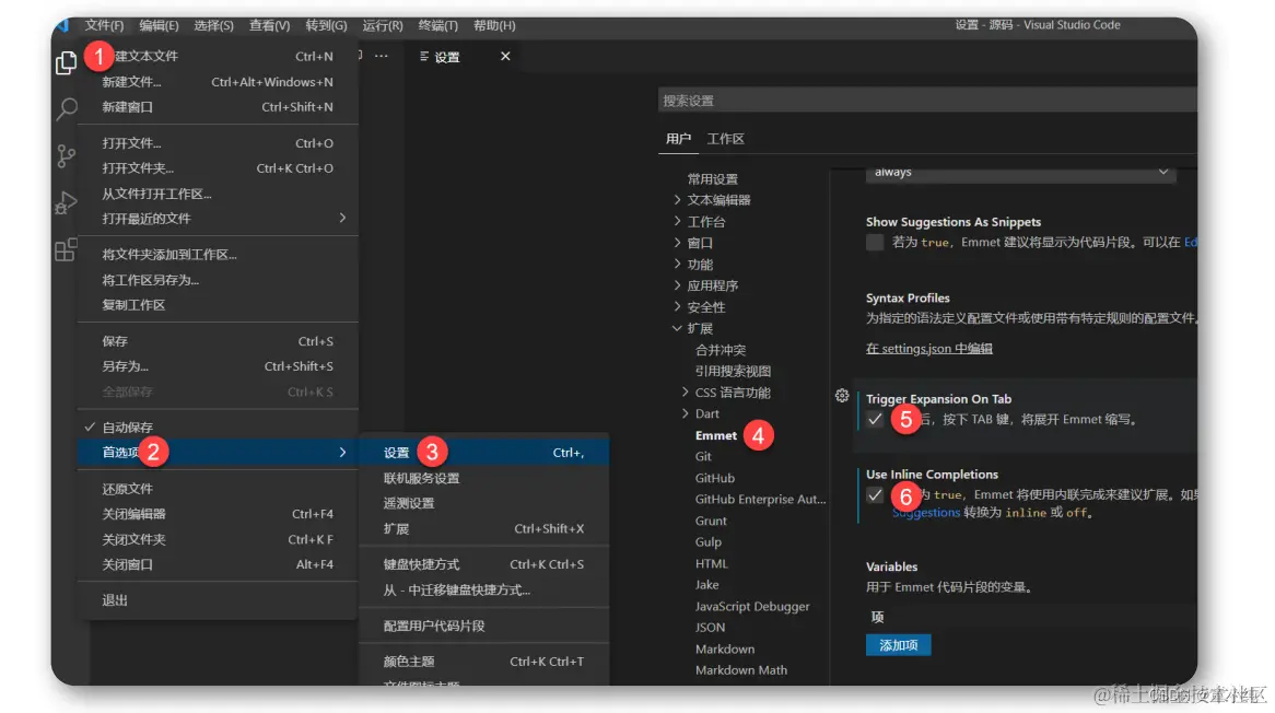 文件 -> 首选项 -> 设置 -> Emmet -> 勾选 Trigger Expansion On Tab 和 Use Inline Completions