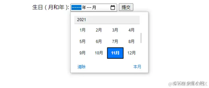 生日 ( 月和年 ): <input type="month" name="bdaymonth">