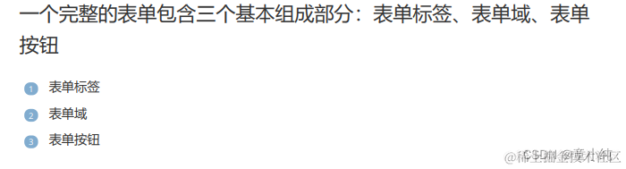 表单是由容器和控件组成的,一个表单一般应该包含用户填写信息的 输入框,提交按钮等,这些输入框,按钮叫做控件,表单就是容器,它能 够容纳各种各样的控件