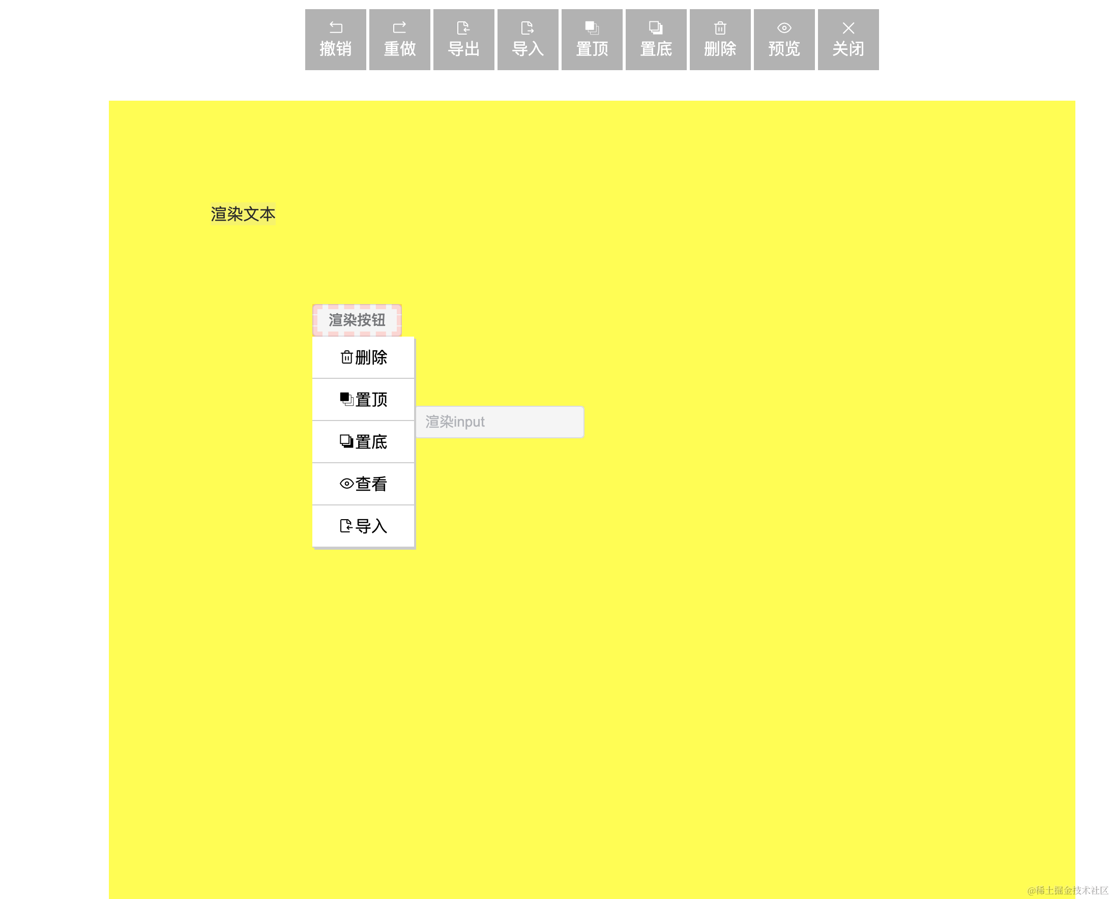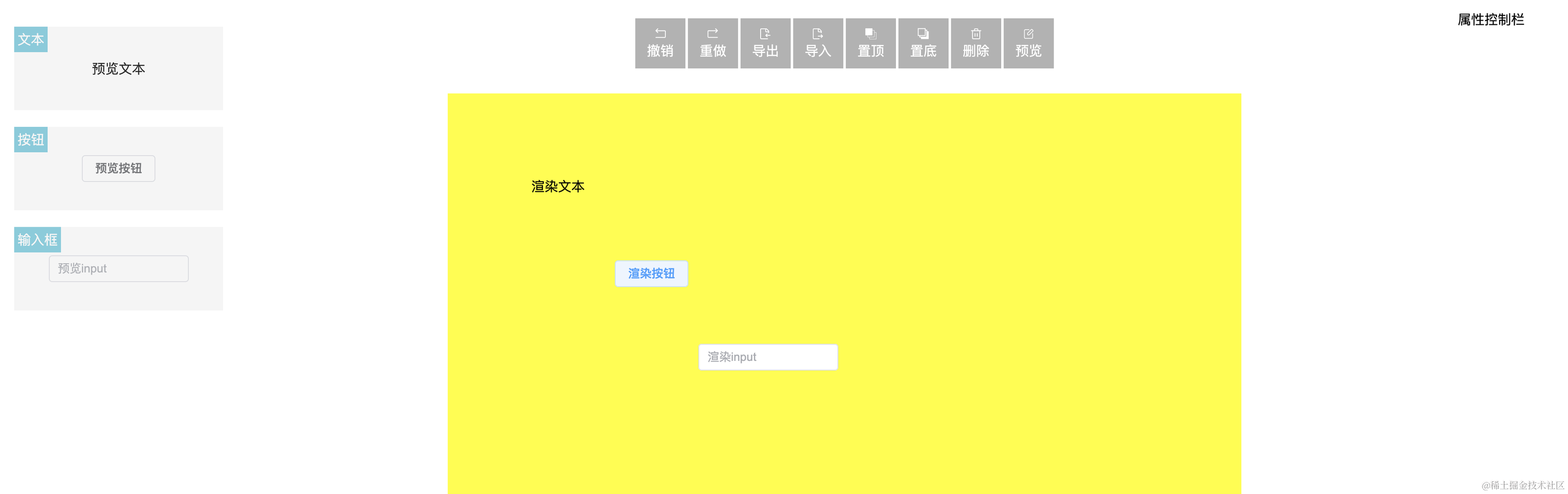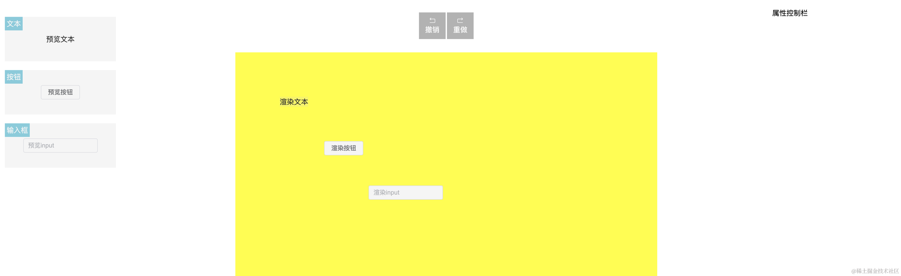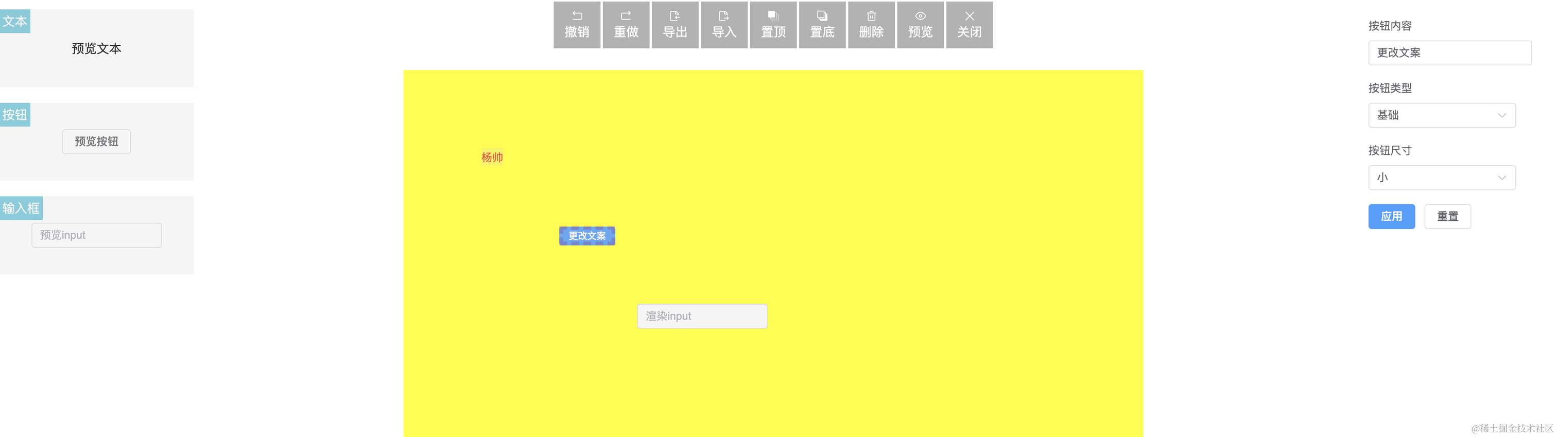 - 组成:组件区(物料)、编辑/预览区,属性区/事件区、通过拖拽组件生成JSON,通过JSON渲染出页面(采用 JsonSchema 描述页面)。