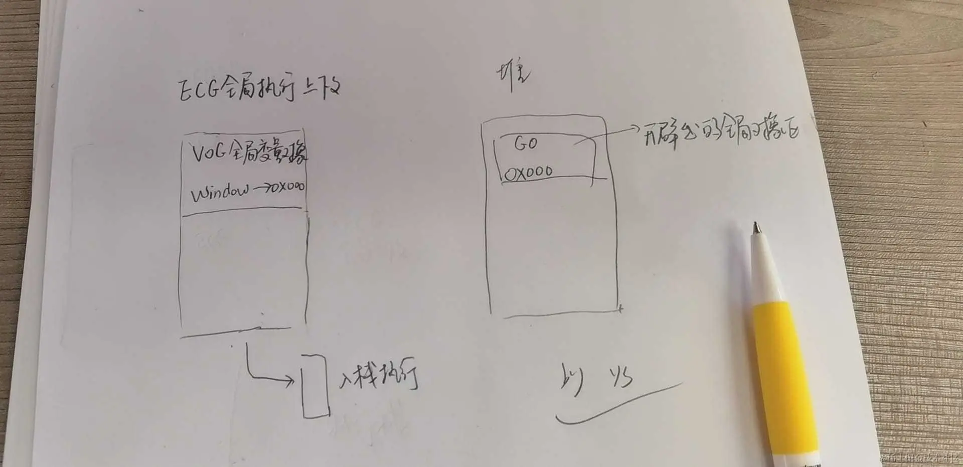 - 首先,会创建 EC(G)「全局执行上下文」,其中包含 VO(G)「全局变量对象」,VOG 中默认挂载了 window: 0x000,指向堆内存中的 GO 对象的16进制地址,这些都是浏览器的默认行为,然后ECG 入栈。
