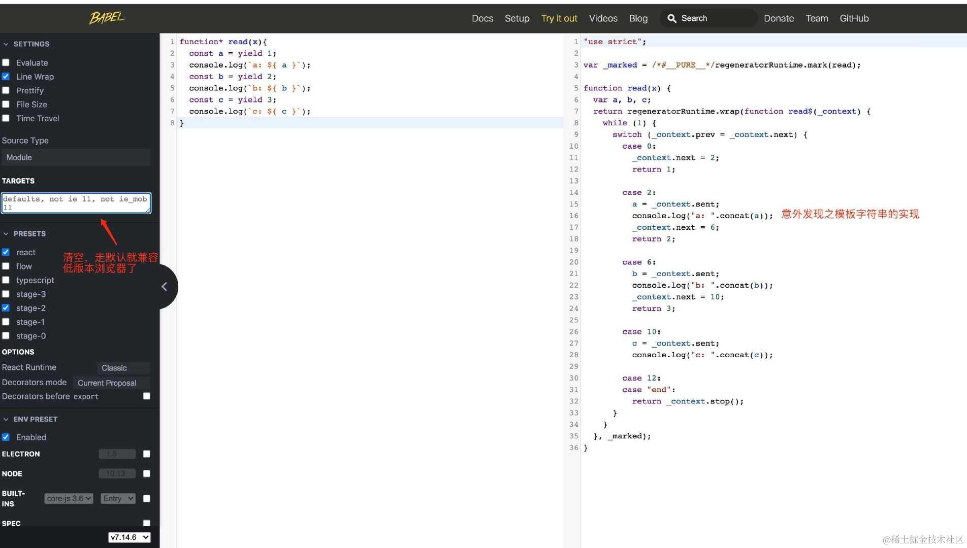 我们继续之前的做法,去 bebel 官网看下 async、await 的实现方式: