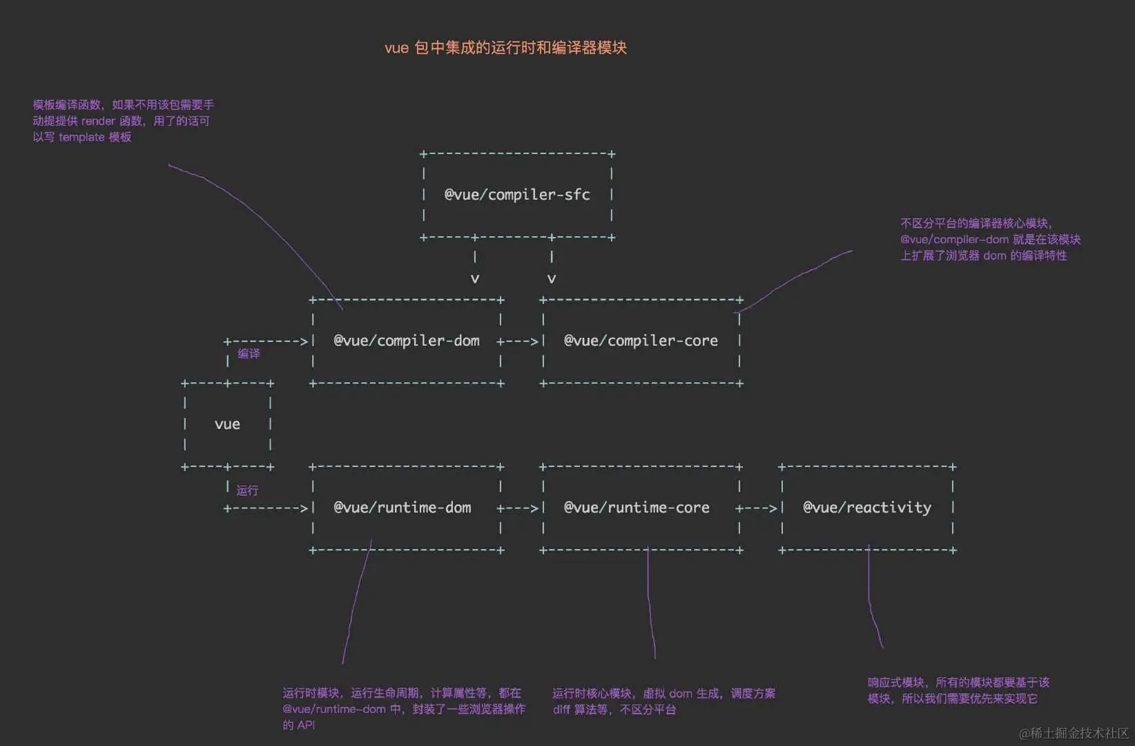 - runtime-core:与平台无关的运行时核心 (可以创建针对特定平台的运行时 - 自定义渲染器)