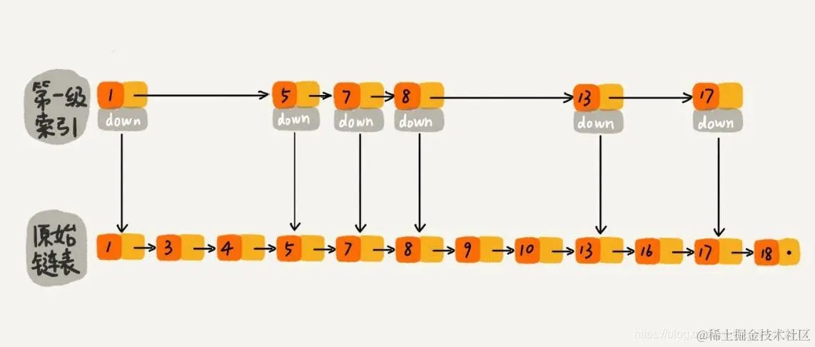 现在我们有个场景,想快速找到上图链表中的 10 这个元素,只能从头开始遍历链表,直到找到我们需要找的元素。查找路径:1、3、4、5、7、8、9、10。这样的查找效率很低,平均时间复杂度很高O((n))。那有没有办法提高链表的查找速度呢?如下图所示,我们从链表中每两个元素抽出来,加一级索引,一级索引指向了原始链表,即:通过一级索引 7 的down指针可以找到原始链表的 7 。那现在怎么查找 10 这个元素呢?