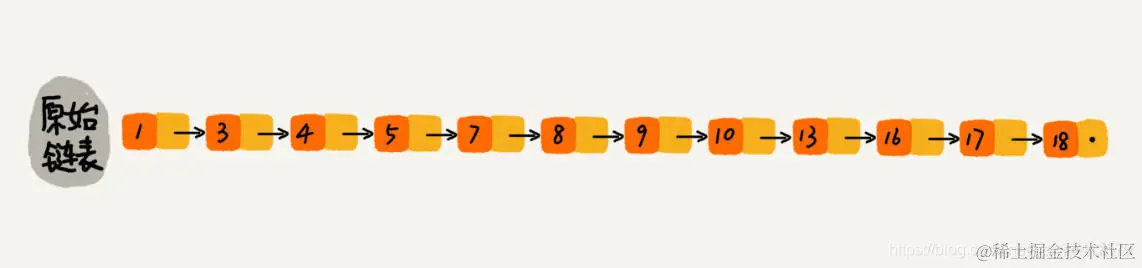 如下图所示,假如一直往原始列表中添加数据,但是不更新索引,就可能出现两个索引节点之间数据非常多的情况,极端情况,跳表退化为单链表,从而使得查找效率从 O(logn) 退化为 O(n)。那这种问题该怎么解决呢?我们需要在插入数据的时候,索引节点也需要相应的增加、或者重建索引,来避免查找效率的退化。那我们该如何去维护这个索引呢?