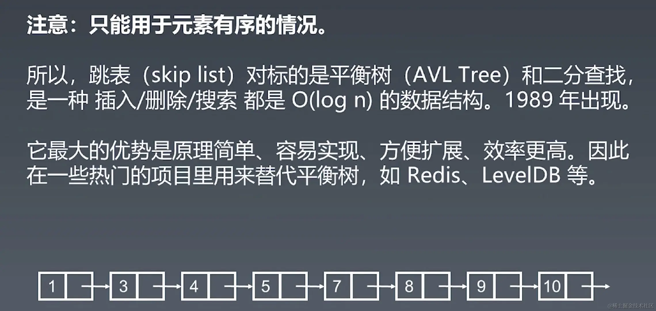 - 跳表查询、插入、删除的时间复杂度为O((log n)),与平衡二叉树接近;