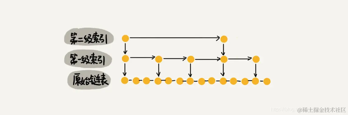 到这里大家应该已经明白了什么是跳表。跳表是可以实现二分查找的有序链表。