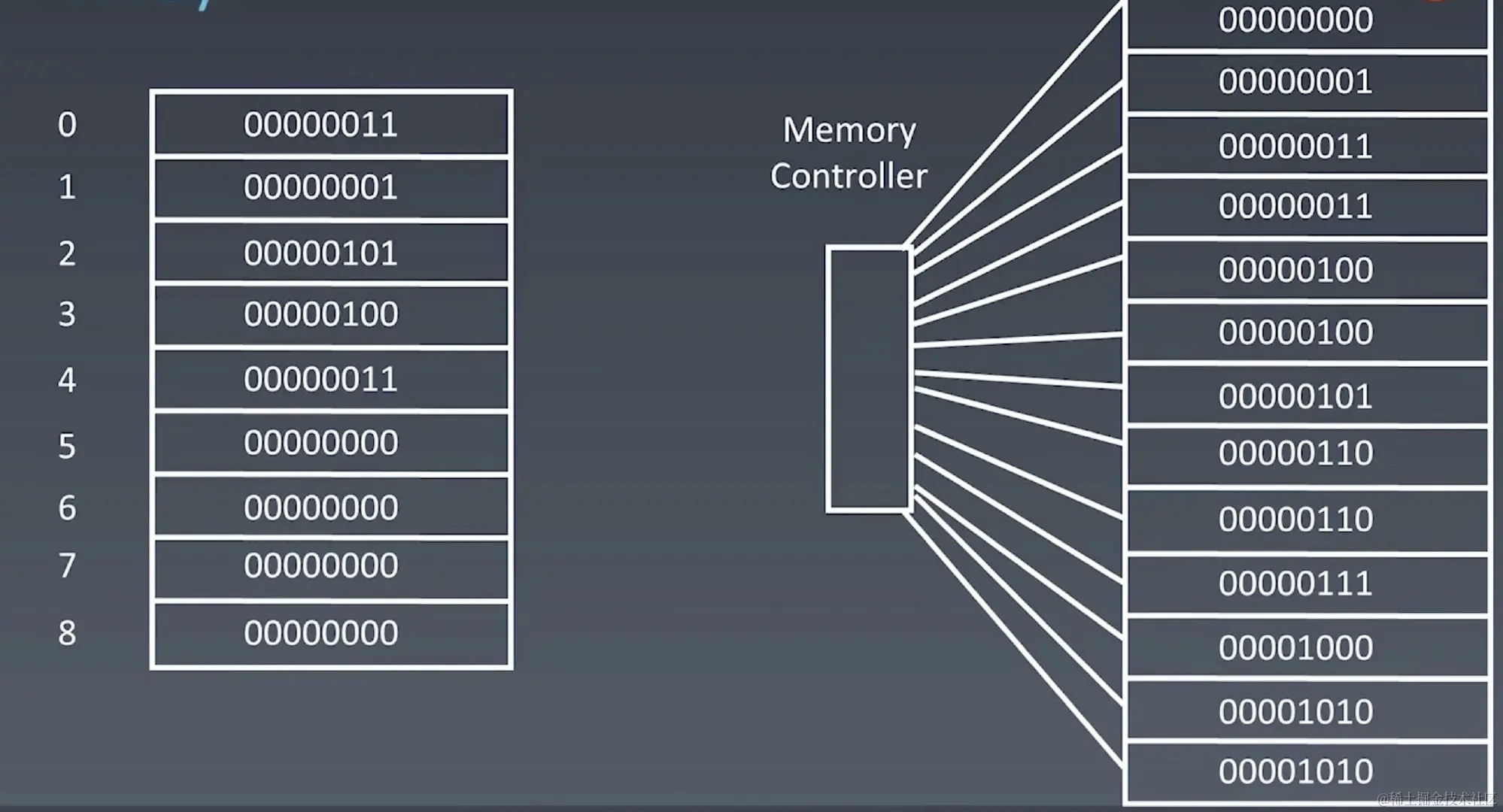 数组底层的硬件实现的话,有一个叫做内存管理器的东西,每当你申请一个数组,计算机实际上是在内存中给你开辟了一段连续的地址。每一个地址((该数组上每一个元素所在的地址))都可以通过内存管理器进行访问,下图就为数组相应的内存地址,所以访问第一个元素和访问任意一个元素的时间复杂度是一样的, 也就是常数级的访问,为 O((1))