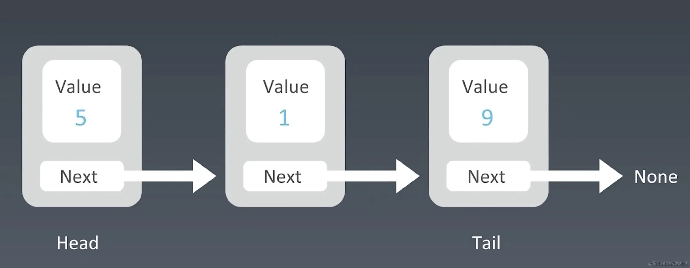 链表这个数据结构就是为了弥补我们前面提到的数组某些操作时间复杂度过高的缺陷, 链表每个节点是什么呢? 一般我们定义个 class Node { }, 里面至少包含2个成员变量value和next,每个节点就是该类的实例化对象啦,next指向下一个元素,串在一起就构成了类似于数组的一个结构。如果只有一个next指针的话,我们叫做单链表,如果还有个先前指针((prev或者previous))的话,就叫做双向链表,整个链表的头结点为head, 尾节点为tail, tail节点的指针的next一般指向none,但是如果tail节点的next指回head节点,那么这就叫做循环链表,类似于一条头尾连接的蜈蚣或环状蛇。