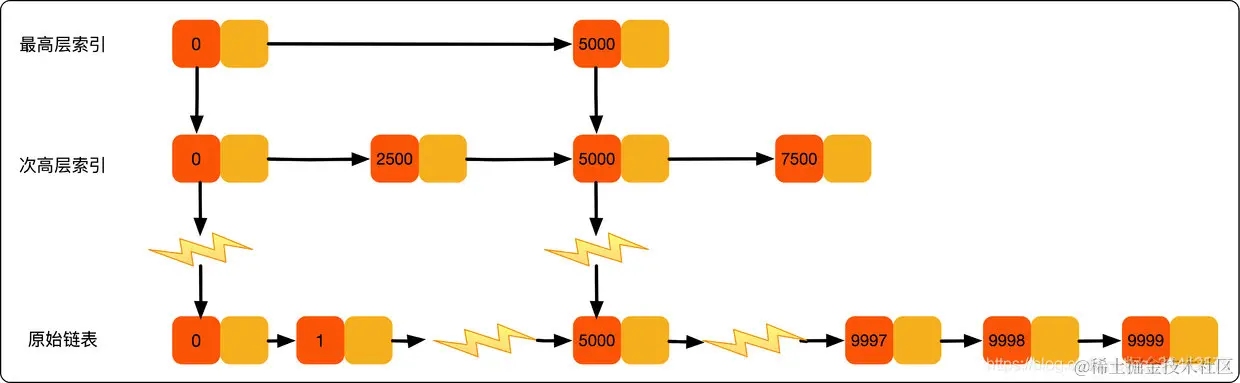 可能同学们会想,从上面案例来看,提升的效率并不明显,本来需要遍历8个元素,优化了半天,还需要遍历 4 个元素,其实是因为我们的数据量太少了,当数据量足够大时,效率提升会很大。如下图所示,假如有序单链表现在有1万个元素,分别是 0~9999。现在我们建了很多级索引,最高级的索引,就两个元素 0、5000,次高级索引四个元素 0、2500、5000、7500,依次类推,当我们查找 7890 这个元素时,查找路径为 0、5000、7500 … 7890,通过最高级索引直接跳过了5000个元素,次高层索引直接跳过了2500个元素,从而使得链表能够实现二分查找。由此可以看出,当元素数量较多时,索引提高的效率比较大,近似于二分查找。