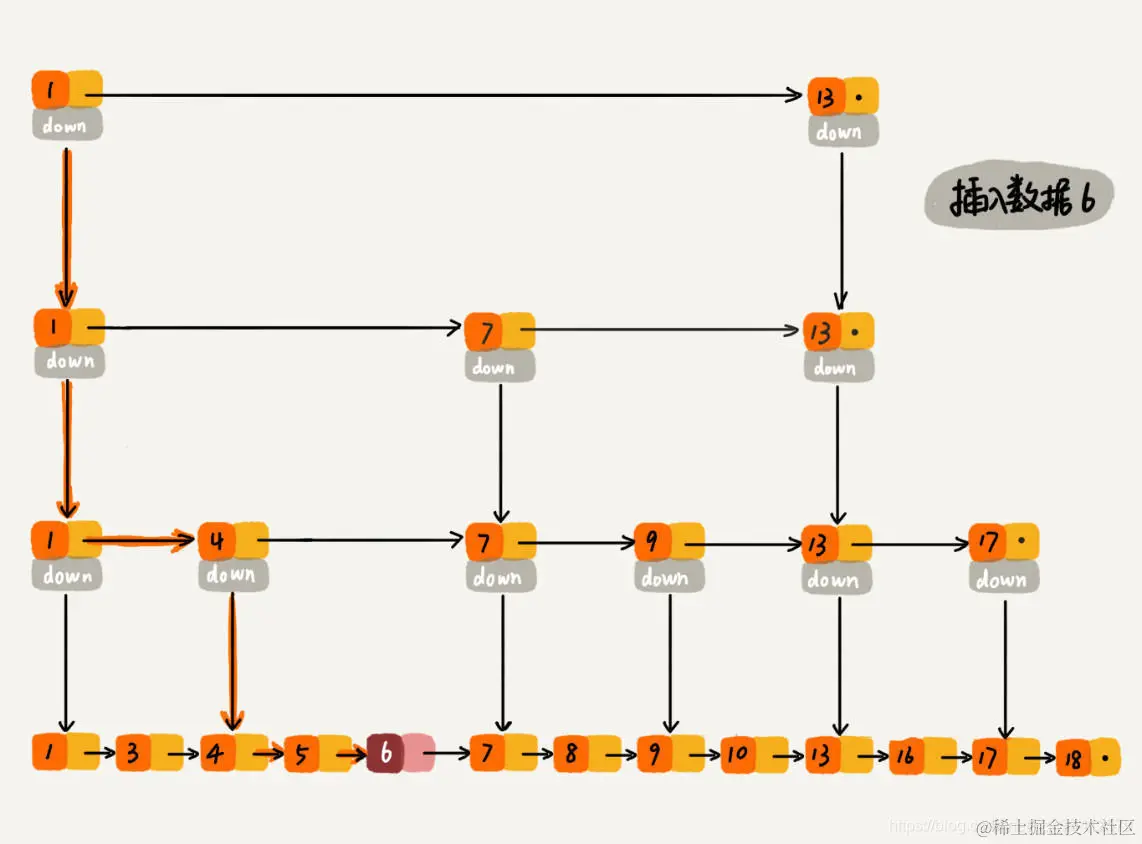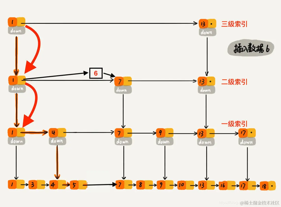 过程大概理解了,再通过一个例子描述一下跳表插入数据的全流程。现在我们要插入数据 6 到跳表中,首先 randomLevel() 返回 3,表示需要建二级索引,即:一级索引和二级索引需要增加元素 6。该跳表目前最高三级索引,首先找到三级索引的 1,发现 6 比 1大比 13小,所以,从 1 下沉到二级索引。