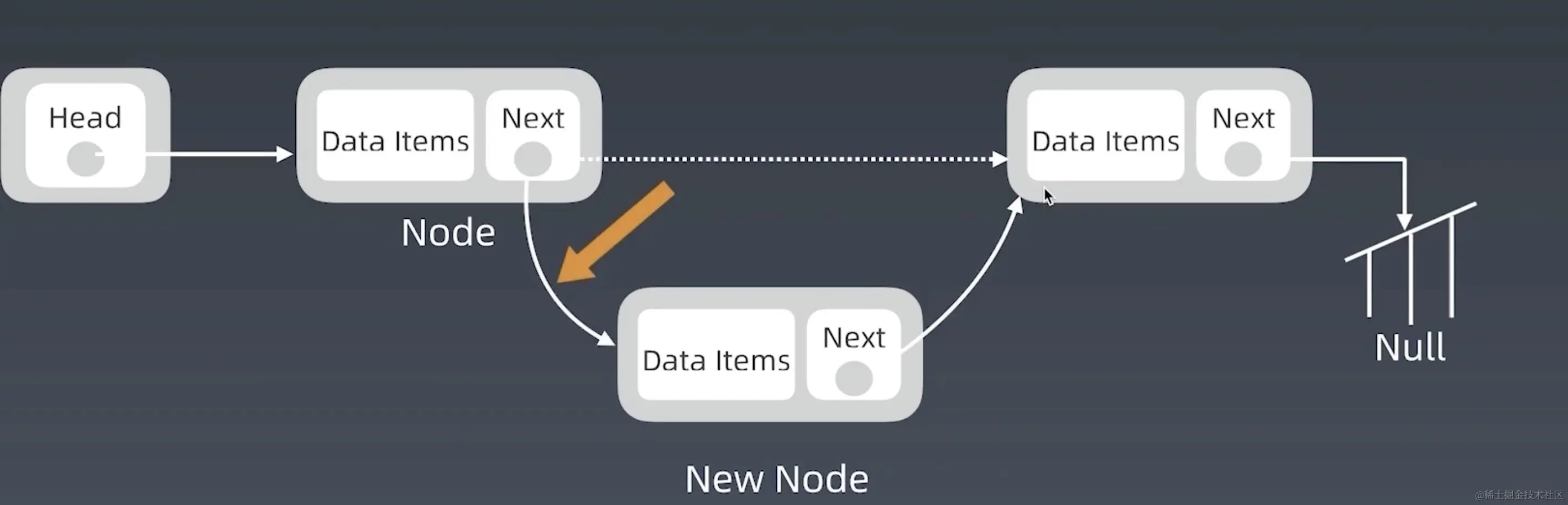 插入元素的操作简化为只需要把前面节点的next指向新节点,新节点的next元素指向之前的下一个节点即可,这样的话总共操作两次,是常数次的,所以时间复杂度是 O((1))
