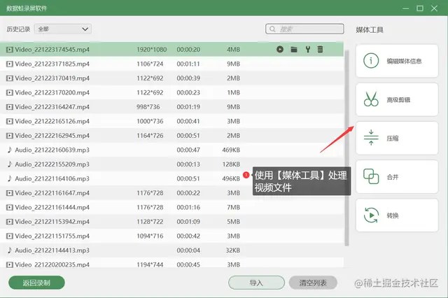 **步骤5.**在接下来进入的【录制历史】里面,我们可以使用左侧工具对文件进行(压缩、转换、合并)等后期处理。