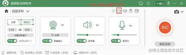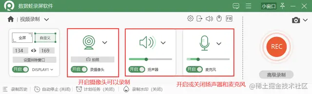 **步骤3.**点击软件主界面的【视频录制】模式,来到【视频录制】页面,开启【摄像头】,这样可以在录制PPT时,录入人脸(画中画录制模式)。接着开启扬声器(录制系统声音)或者麦克风(录制外部声音)接着选择录制的范围(默认全屏录制),然后点击【REC】按钮进行录制。