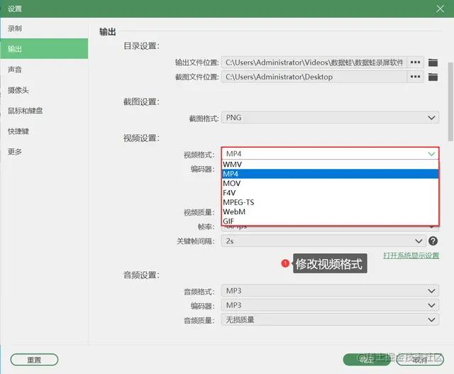 备注:如何录制不同格式的视频?(视频默认格式为MP4)点击【视频录制】右上角的【输出设置】,在视频格式处可以修改视频的格式。