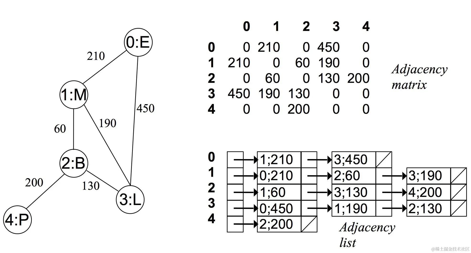 - 在一个有权图中,矩阵坐标中每个位置值代表该两点之间的权重,0 表示该两点不相连