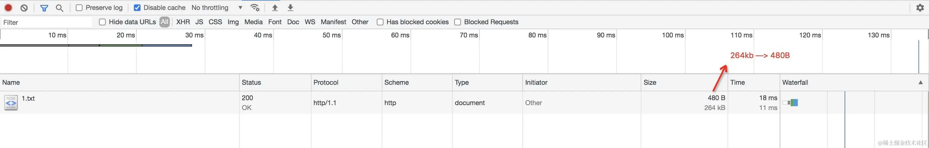 - 命中之后不会发送 http 请求到服务器,且状态码为 200, 来源于 memory cache 或者 disk cache。