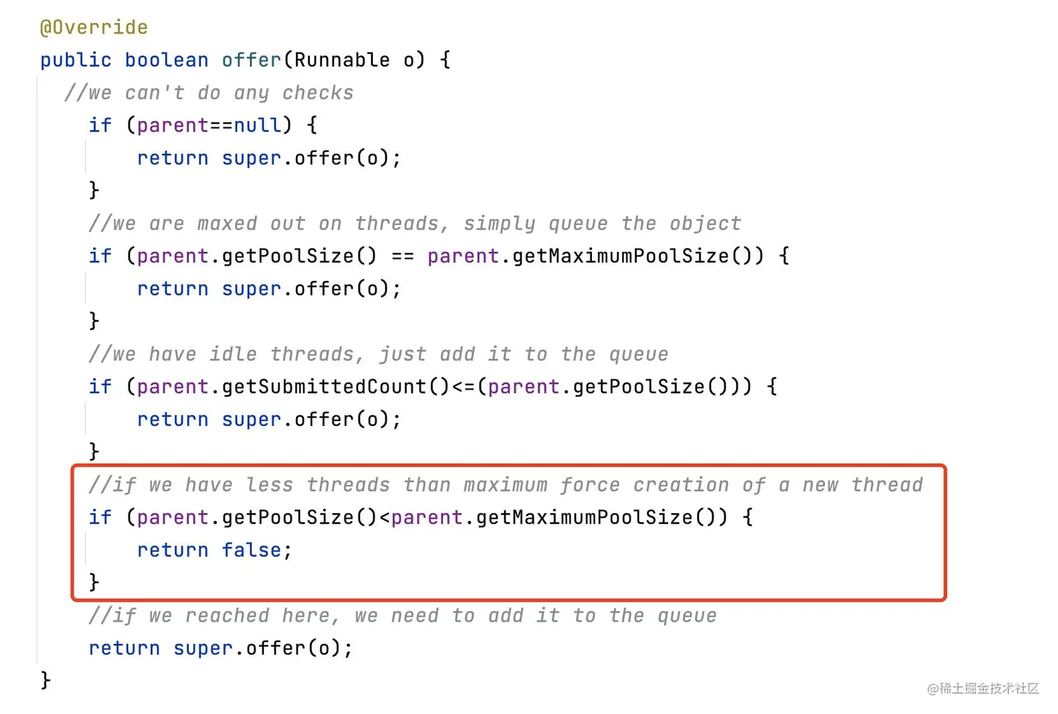 所以,tomcat重写了LinkedBlockingQueue的offer方法,如果当前提交的任务数submittedCount大于核心线程数,并且小于最大线程数的情况下,就去创建一个新线程。