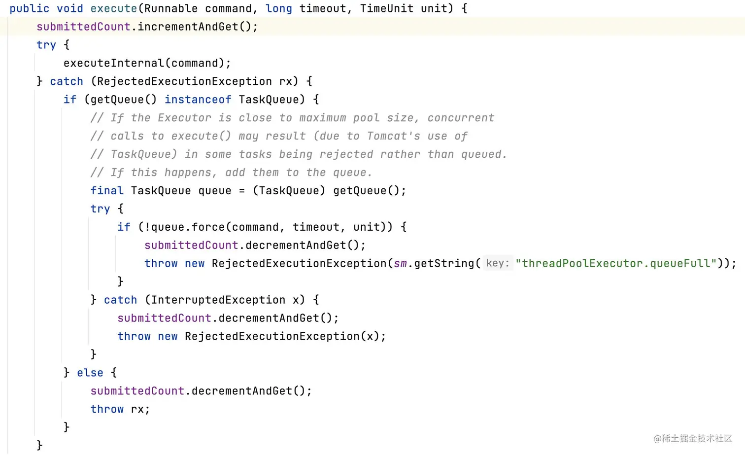 如果我们点进executeInternal方法,就会发现其实现代码和JAVA原生线程池的execute方法是一样的,tomcat只是将原生执行方法包装了一层。