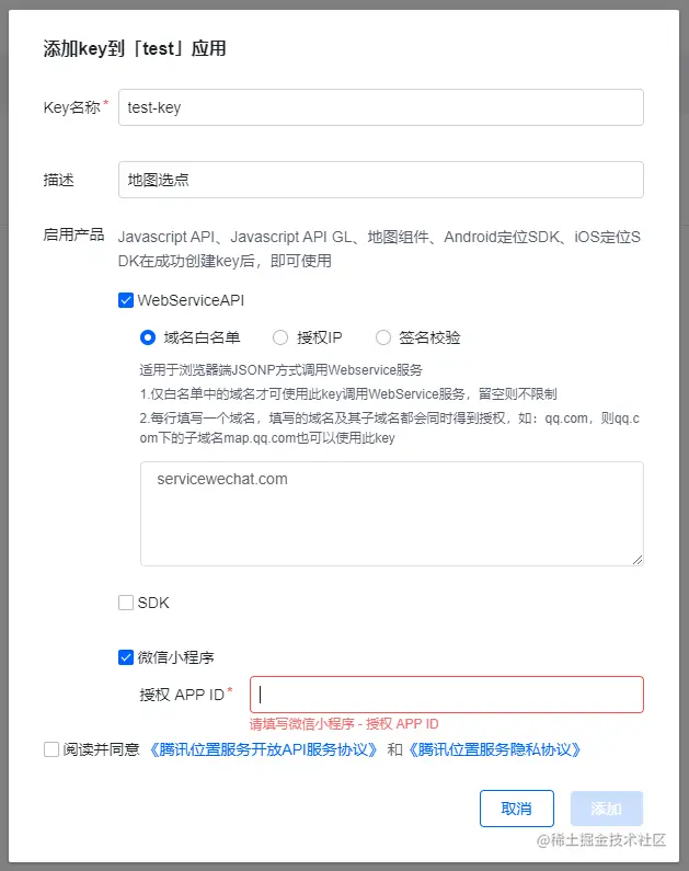 调用地图选点插件需要申请腾讯位置服务的服务账号,key是开发者的唯一标识。开发者通过key可以调用腾讯位置服务官网提供的相关服务。