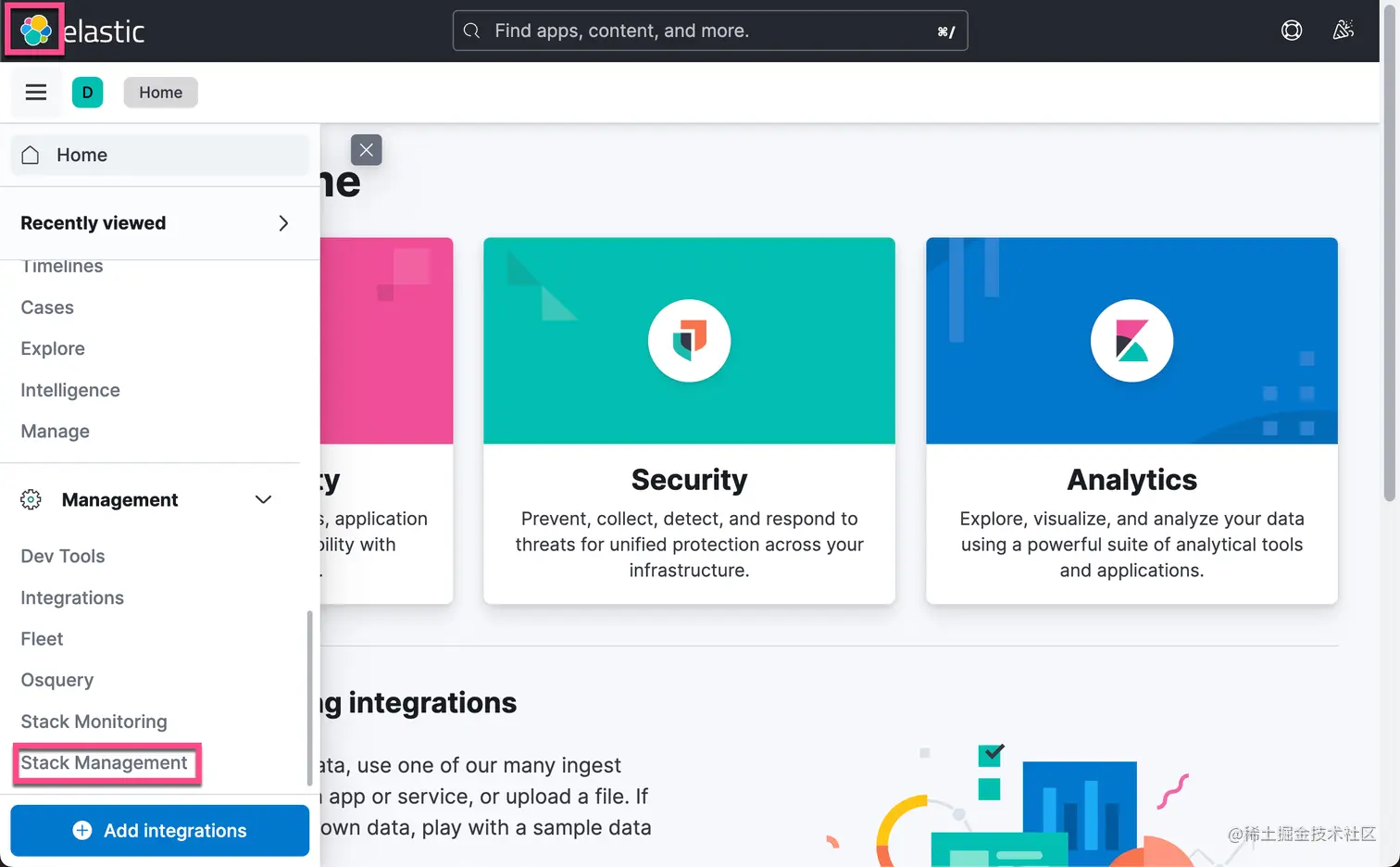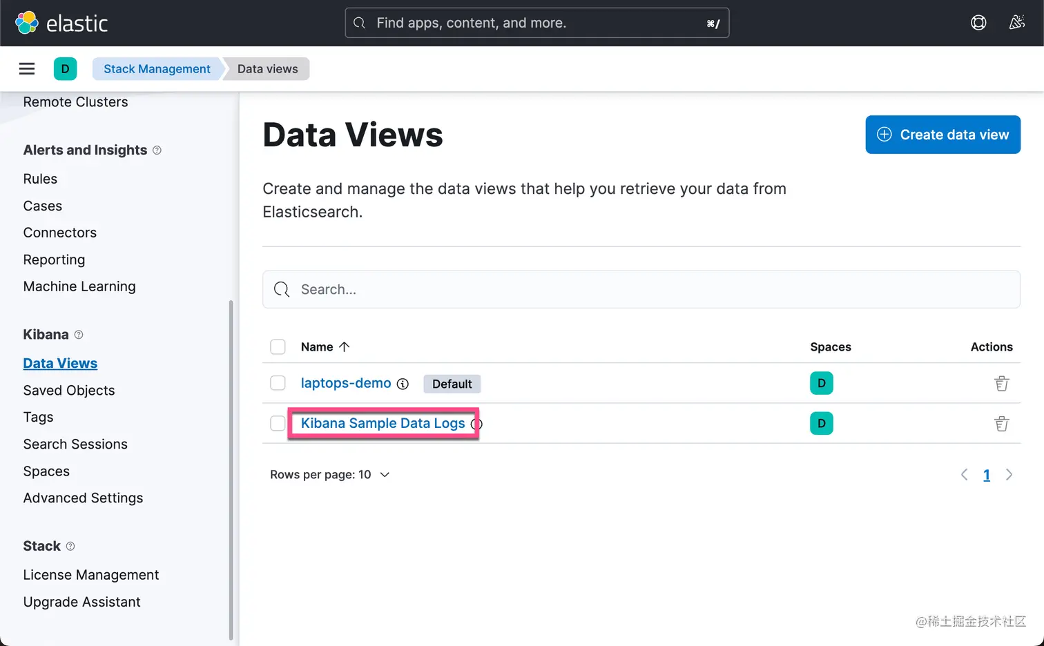 一旦你确认数据已到达你的 Elasticsearch。 在 Kibana 上,你需要进入 Stack Management 选项卡,选择索引模式,刷新索引字段列表并搜索 message.keyword 字段,检查该字段现在是否可聚合。