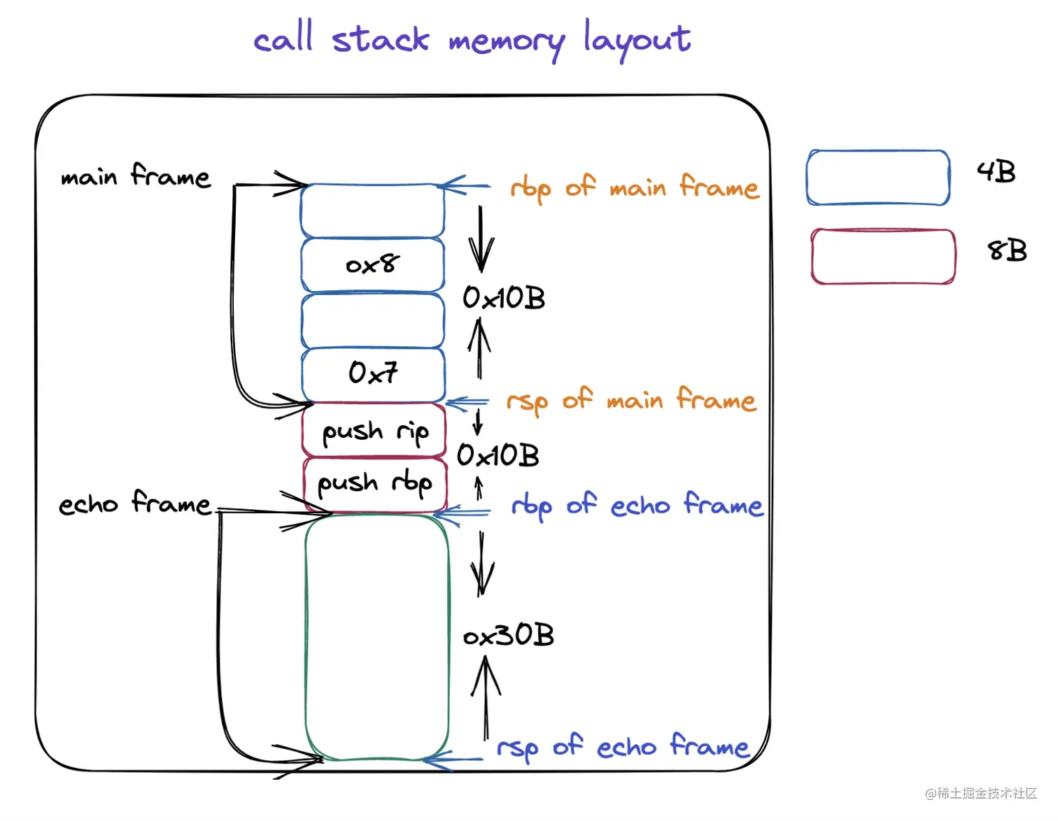 我们在来分析一下 echo 函数当中 printf 函数参数的传递情况,第二个参数和第三个参数分别是 a8, a7,应该分别保存到寄存器 rsi/esi, rdx/edx 当中,在上面的汇编代码当中已经使用注释的方式进行标注出来了,从下往上进行分析可以看到 a8 保存在位置 0x18(%rbp),a7 保存在 0x10(%rbp),这个地址正是 main 函数保存 a7(当进入函数 echo 之后,a7,和 a8 的位置分别是 rsp + 0x10), a8(当进入函数 echo 之后,a7,和 a8 的位置分别是 rsp + 0x10 + 0x8) 的位置,具体可以结合上面的内存布局图进行分析。