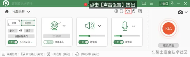 **第3步.**点击软件主界面左侧的【视频录制】,进入【视频录制页面】,在此页面我们可以先根据录制需求开启扬声器(录制电脑内部系统声音)或者麦克风(录制外部声音);在录制时,有不想录入的窗口,可以点击页面左下角的【设置排除窗口】进行排除,接着选择录制的范围(默认全屏)然后点击【REC】按钮进行录制。