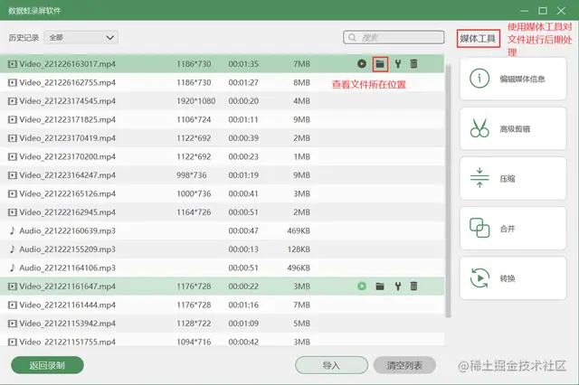 **第5步.**在【录制历史】页面,您可以点击录屏文件右侧的【文件夹】图标查看文件所在位置,还可以使用右侧【媒体工具】对文件进行后期处理(压缩、合并、转换),在进行文件合并时,还可以导入本地视频文件。