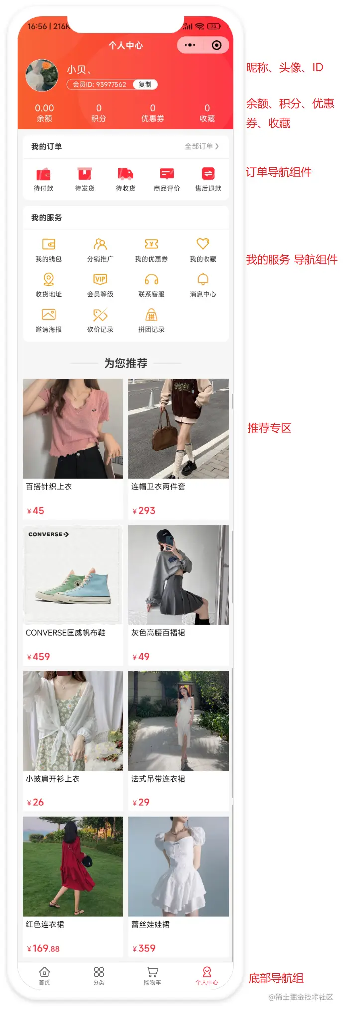 由用户昵称、头像、ID、余额、积分、优惠券、收藏、订单导航组件、我的服务导航组件、推荐专区、底部导航栏组成,页面分类规整,一目了然,能够快速找到自己需要的功能,方便商城使用与用户沟通