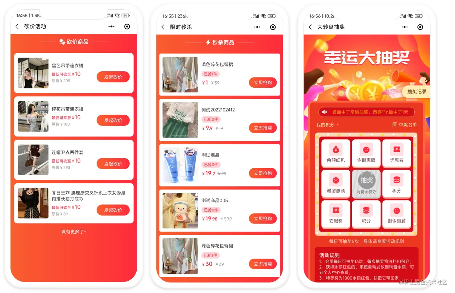 拼团、秒杀、砍价、优惠券、积分商城等丰富的营销功能,制造紧张氛围、刺激用户产生强烈的购买欲望