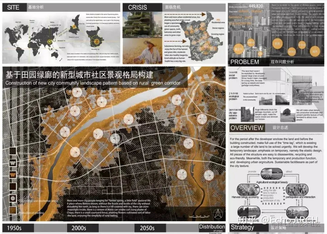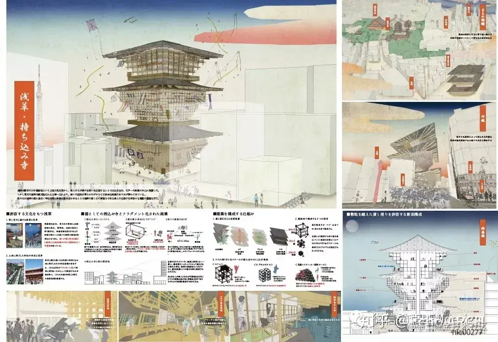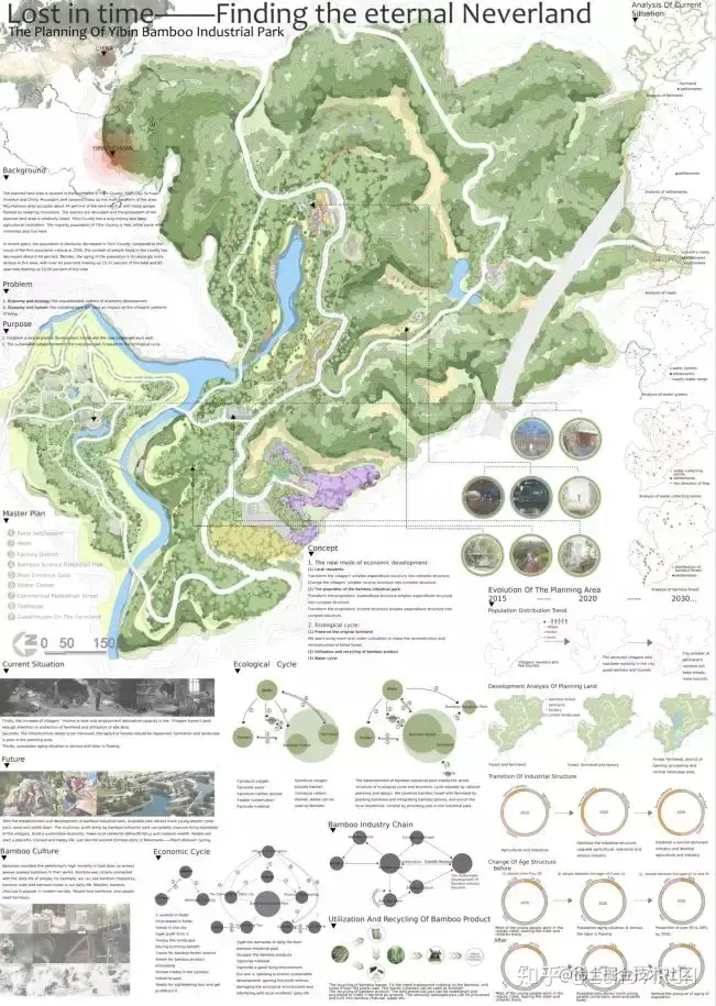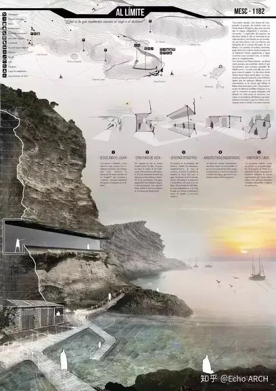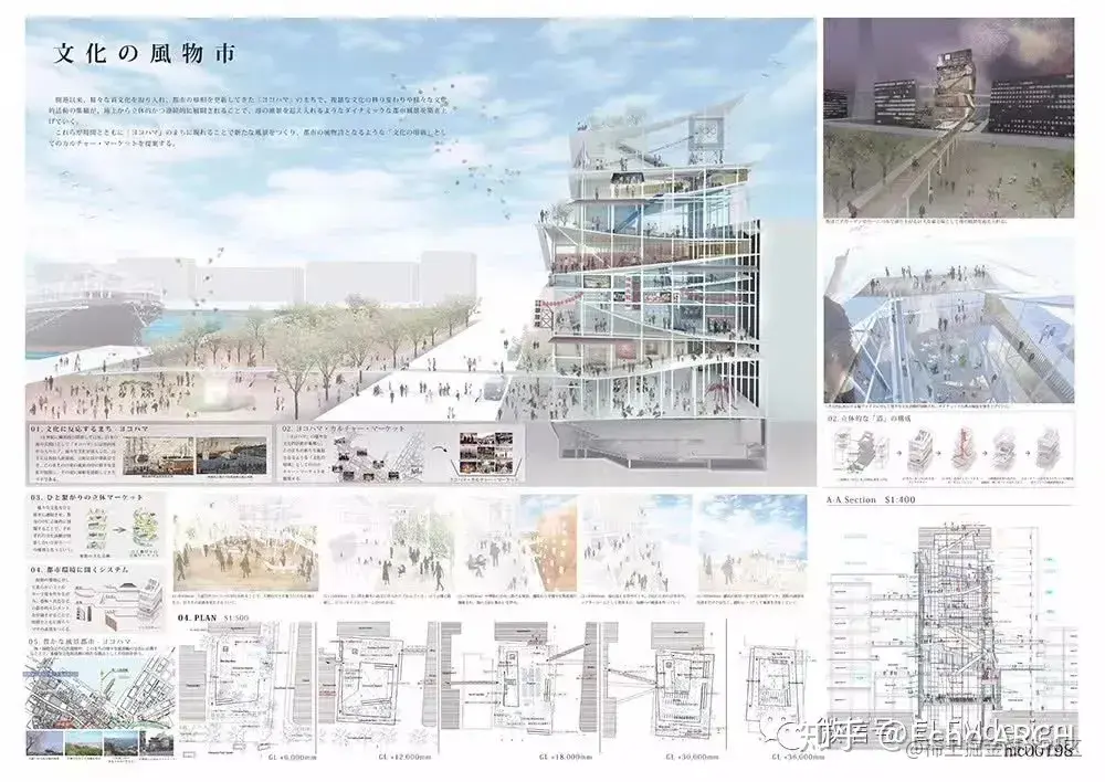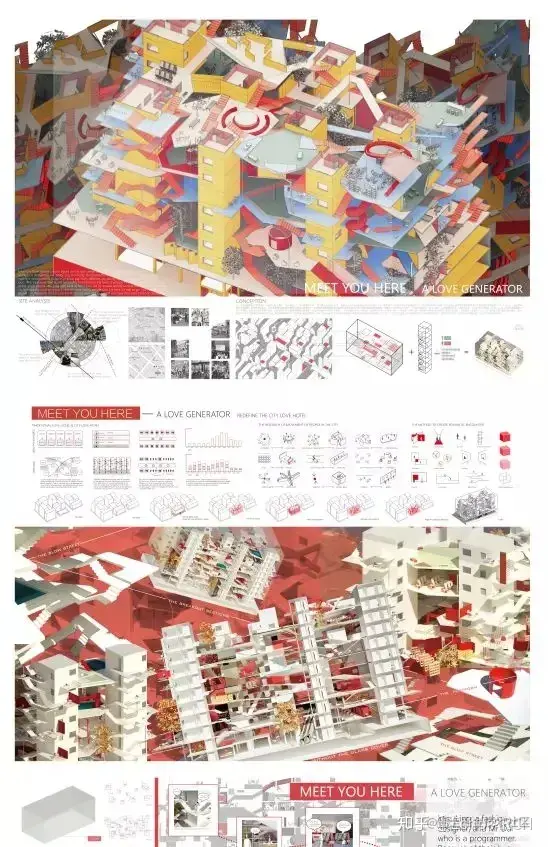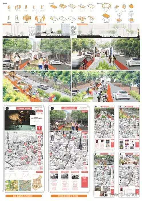 我们在排版时需要考虑图形之间的逻辑性,不论课程设计亦或竞赛投标,表现图之间的秩序性应当作为构图的基础,把这种关系作为隐性结构,做出可以“讲故事”的图纸表现。如果没有很特别的设计,图片和文字建议大家做黄金分割率的安排。