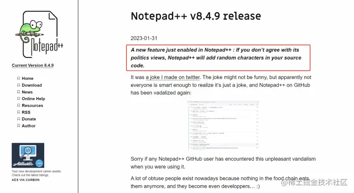 卸载替代Notepad++,notepad++又开始做妖了 栈江湖 2023-02-03 420 阅读1分钟 Notepad ++中刚刚启用的新功能:如果你不同意它的政治观点,notepad++会在你的源代码中添加随机字符。 大家还是卸载换vscode吧