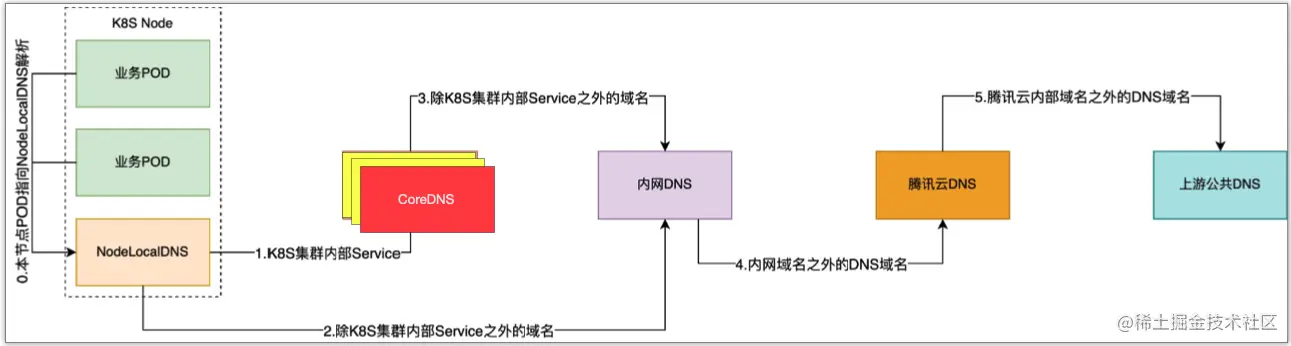 - Node Local DNS上线(2022.09.14 04:30)后新启动的POD内网域名解析将不再受到影响,上线前的POD因dns配置还是coredns,内网域名解析还是会受到影响,影响面同上